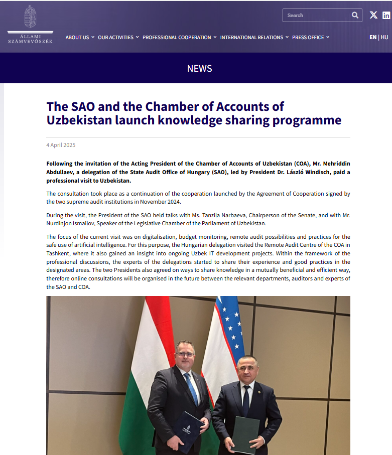 Vengriya Oliy audit organining rasmiy veb-saytida O‘zbekiston Hisob palatasi bilan o‘rnatilgan munosabatlar haqida material chop etildi.