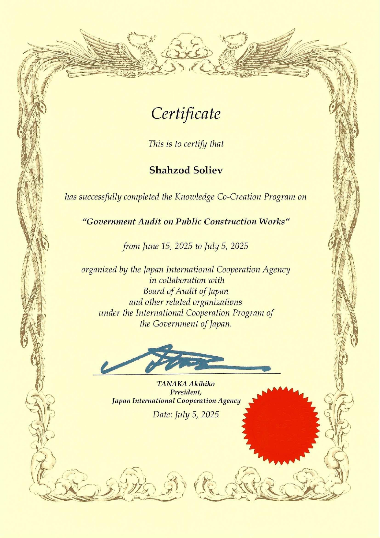 Joriy yilning 15 iyun' – 5 iyul' kunlari Yaponiya xalqaro hamkorlik agentligi (JICA) tomonidan Tokio shahrida “Qurilish ishlari samaradorligi bo‘yicha davlat auditi” mazusida o‘quv trening dasturi bo‘lib o‘tdi. Tadbir JICA tomonidan Yaponiya Audit kengashi (Oliy audit organi) bilan hamkorlikda tashkil etildi.