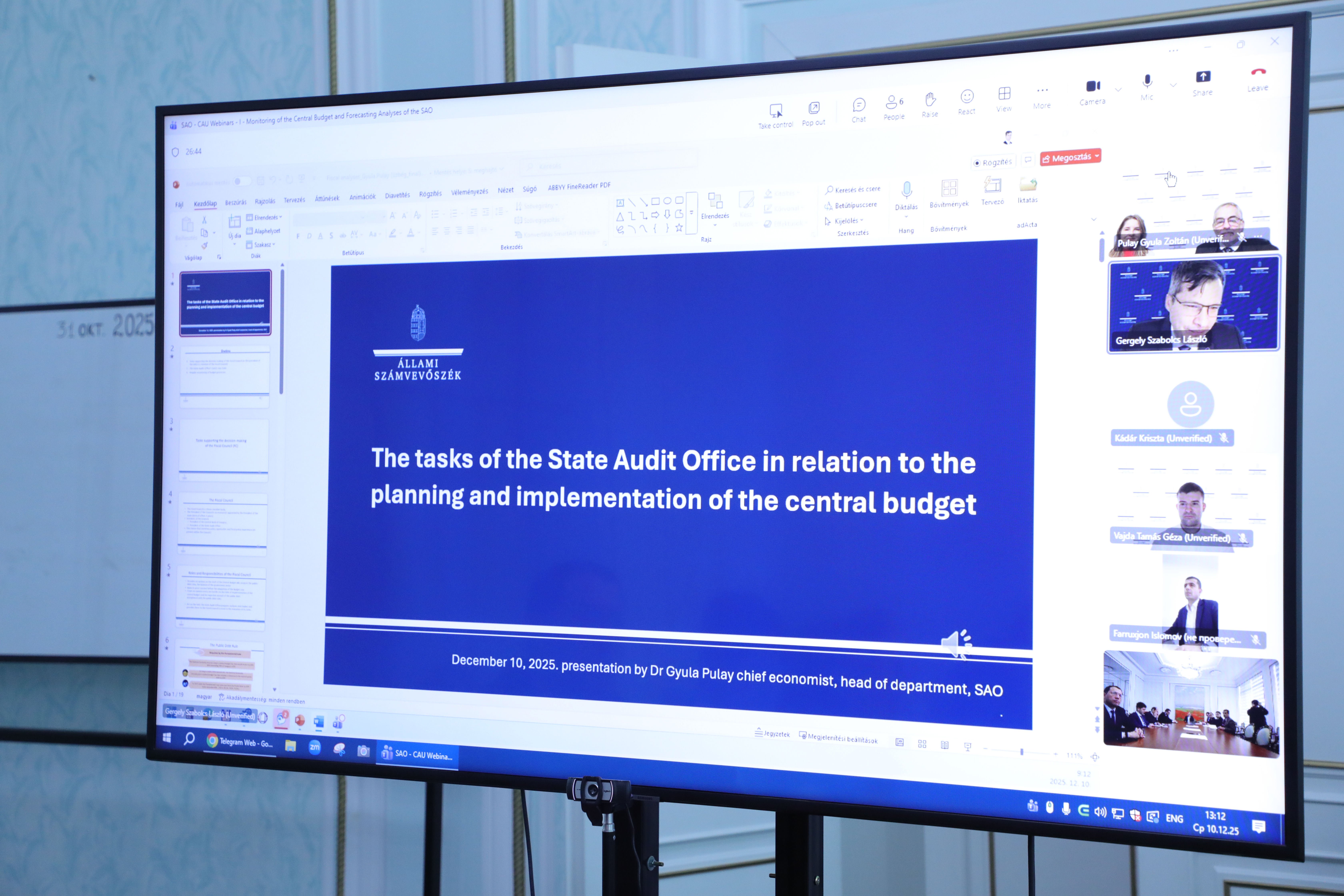 Vebinarda “Markaziy budjetni rejalashtirish va ijro etish bilan bog‘liq Vengriya Davlat auditi idorasining vazifalari” mavzusida taqdimot qilindi. Unda Vengriya Davlat auditi idorasining vazifalari, fiskal kengash qarorlarini qabul qilish jarayonini qo‘llab-quvvatlovchi faoliyat hamda byudjet jarayonlarini muntazam monitoring qilish bo‘yicha ma’lumotlar berildi.