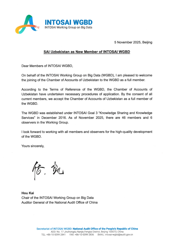 O‘zbekiston Respublikasi Hisob palatasi Oliy audit organlari xalqaro tashkiloti (INTOSAI) doirasida faoliyat yurituvchi Katta hajmli ma’lumotlar (Big Data) bo‘yicha ishchi guruh (Working Group on Big Data) a’zoligiga qabul qilindi.