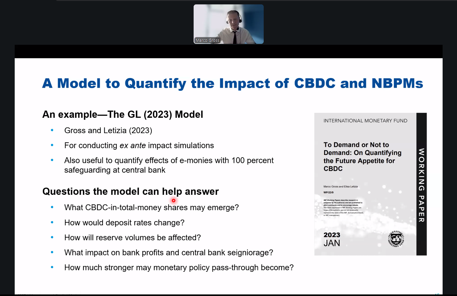 Tadbirda raqamli pul vositalarining saqlanishi, markaziy bank raqamli valyutalari, steyblkoynlar (kriptovalyuta), tokenlangan depozitlar va raqamli pullarning turli xil paydo bo‘layotgan shakllari makromoliyaviy nuqtai nazardan muhokama qilindi. Vebinar Yevropa Markaziy banki, Xalqaro valyuta jamg‘armasi hamda Qozog‘iston Milliy banki vakillari tomonidan o‘tkazildi.